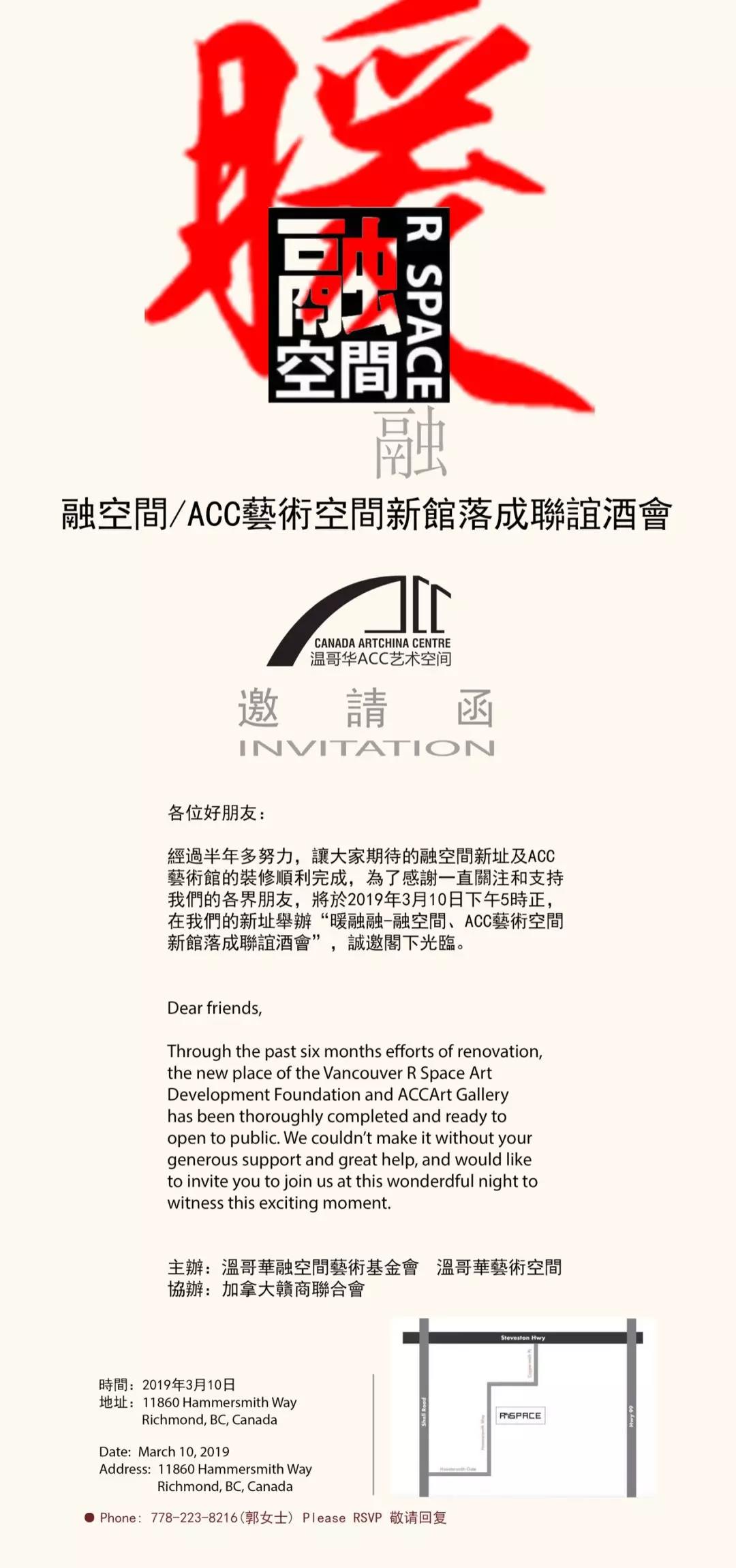 由本会协办,温哥华融空间和温哥华ACC艺术空间主办的(暖融融-融空间,温哥华ACC艺术空间新馆落成)联谊酒会将于3月10号周日下午5时举办。