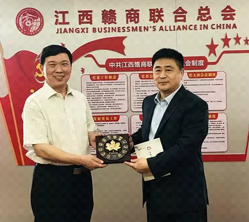 最后,张荣华会长代表加拿大赣商会向江西赣商联合总会赠送了礼物——加拿大各省省徽装饰盘。邓必云书记代表江西赣商联合总会宴请了加拿大赣商会回乡拜访团一行,在热烈友好的气氛中,大家进一步交换了对以后工作的看法,并祝愿赣商在各地的发展都蒸蒸日上。